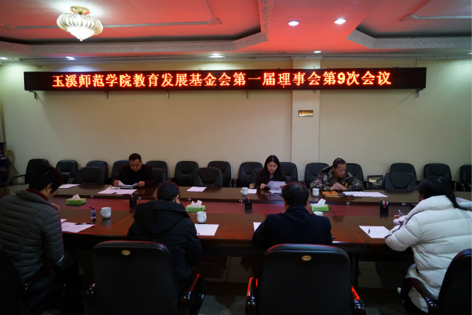 2020年12月31日上午玉溪师范学院教育发展基金会第一届理事会第九次会议在学校第一办公楼一楼会议室召开。理事长杨光,理事邵源诚、冶联凤、向艳玲、魏丽萍、胡正方、史德鹏、王竣,监事宗靖淞出席会议。会议由杨光理事长主持。